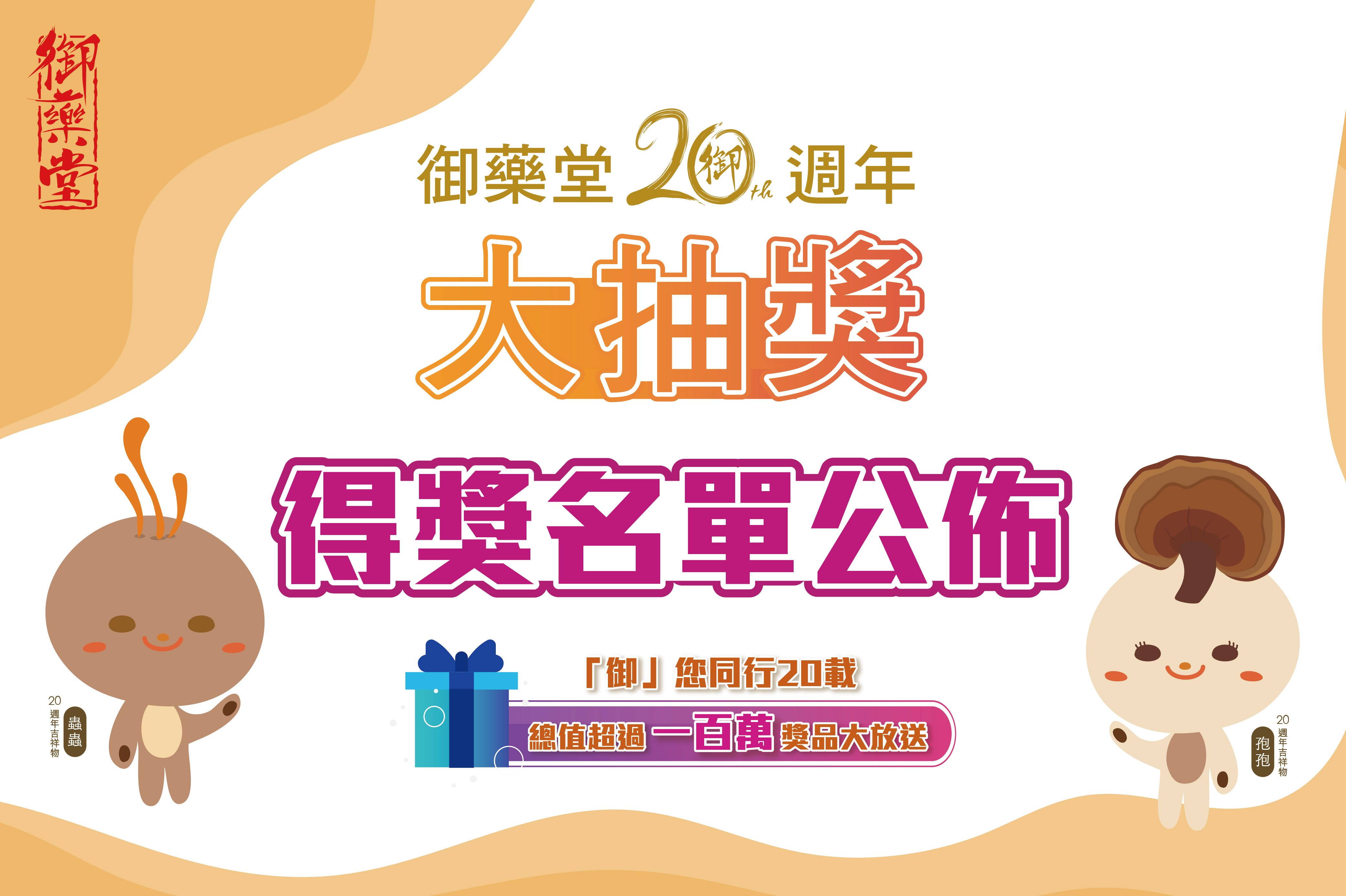「御藥堂20週年大抽獎」已圓滿結束,感謝各位踴躍支持!得獎名單如下: