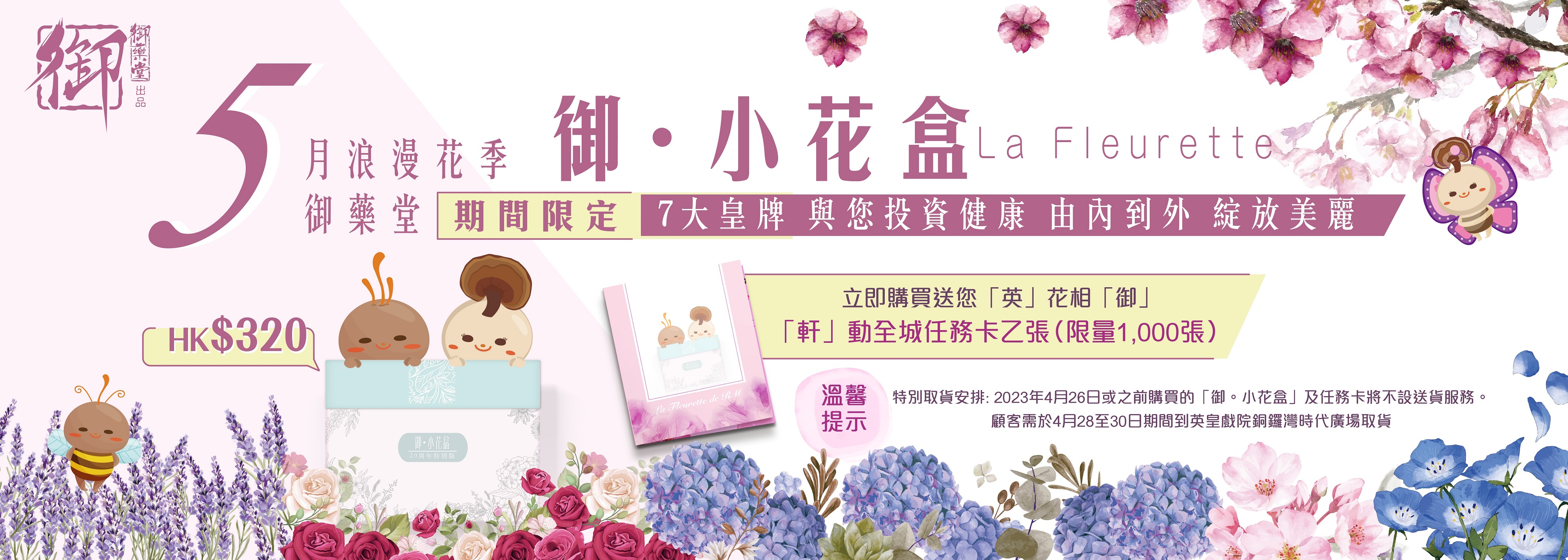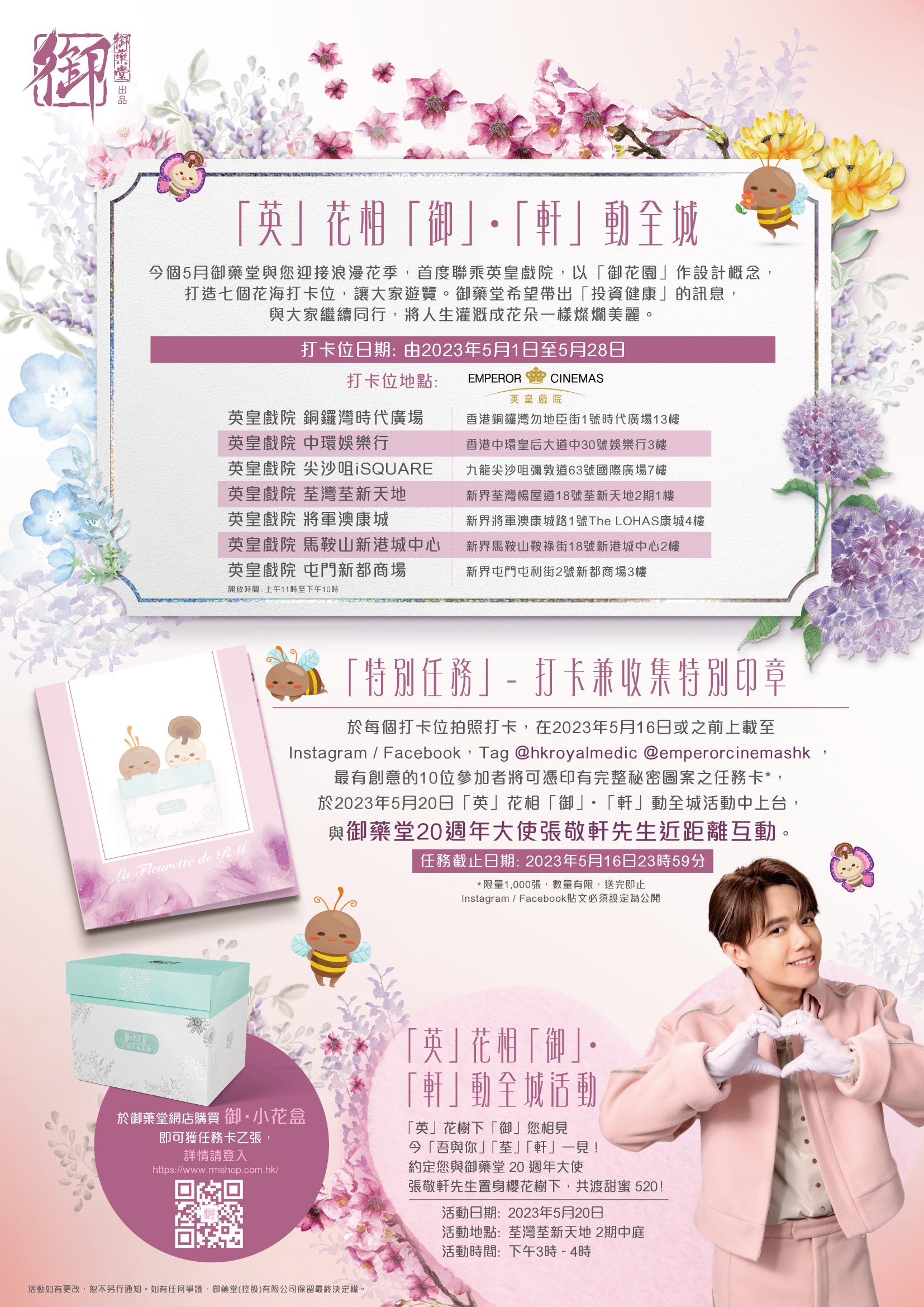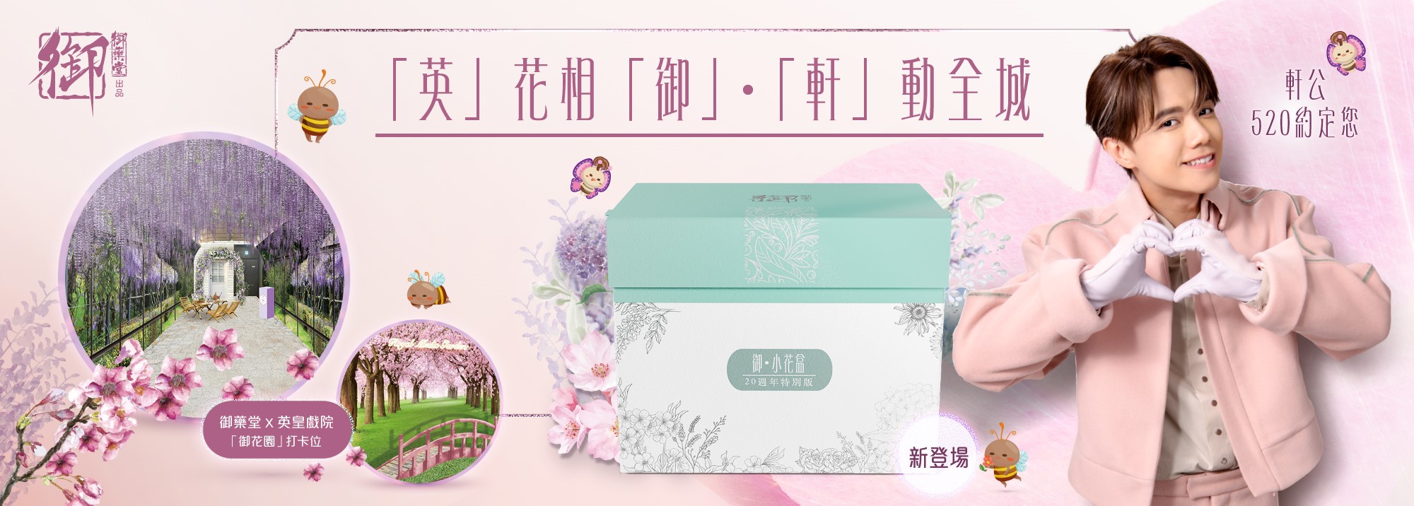 奉天承運,「皇上」詔曰,軒公「御」您相約「520」在花見!御藥堂20週年呈獻︰「英」花相「御」・「軒」動全城大型品牌推廣活動,破天荒於全港英皇戲院打造七個「御花園」為題的打卡位,讓大家置身花海盡情遊覽。此外,大家於指定時間前往「御花園」打卡,即有機會成為幸運兒於520這個浪漫的日子「面聖」,一睹龍顏,與軒公超近距離互動!除此之外,御藥堂更特別推出期間限定20週年特典禮盒—「御・小花盒 La Fleurette」。