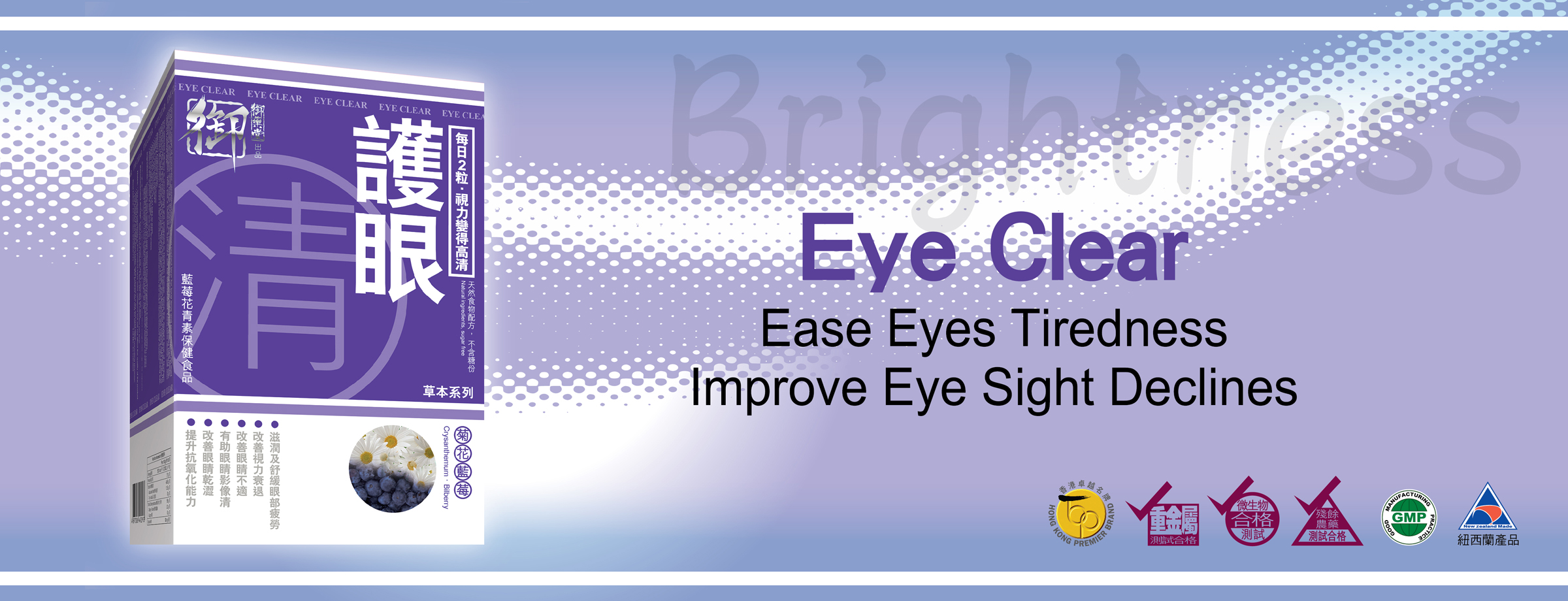 In the city with high technologies, long time usage of computer, sleeplessness, wearing contact lens for long time and pollutants in air all lead to eye health problems, such as unwell feelings, dryness, tiredness, unclear sight and aging. Therefore, Royal Medic has specially developed "Eye Clear" to improve the eye health problem by using high concentrated Bilberry with good quality. With 2 capsules every day, clear eyes can be obtained. Prolonged consumption improves eye sight declines and comforts your eyes.