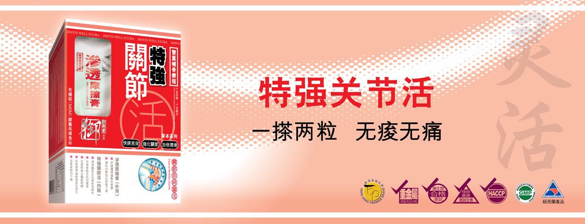 《特强关节活》内含有机硫(MSM)制剂及渗透摩擦膏两种产品,以双管齐下击退关节痛,服用有机硫(MSM)制剂有助提升韧带及关节健康,修补软骨组织,再配合涂抹渗透摩擦膏于患处,可达至内外改善软骨及关节的效果,外敷内服,功效显著。