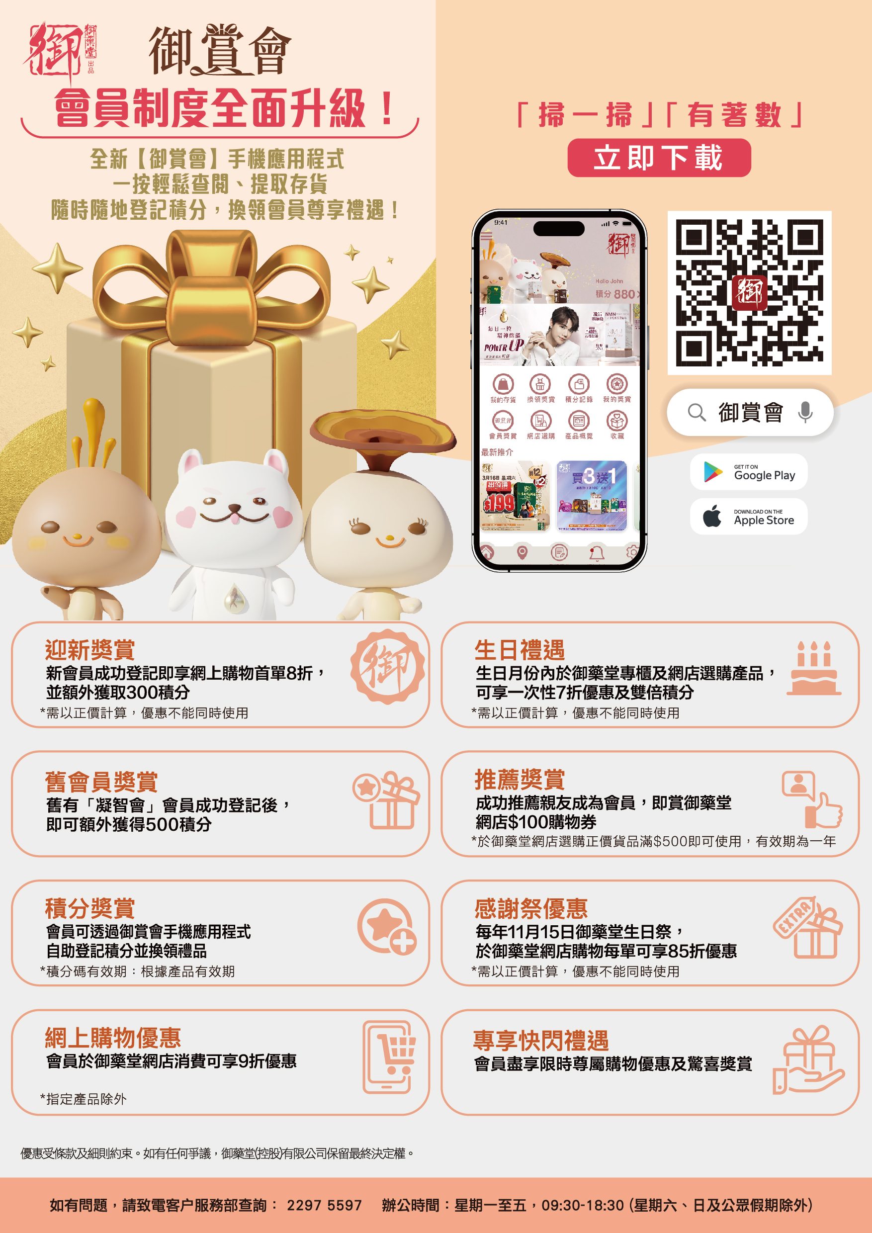 御藥堂全新會員手機應用程式【御賞會】現已登場並取代舊有【凝智會】。會員可於手機應用程式登記積分換領獎賞。